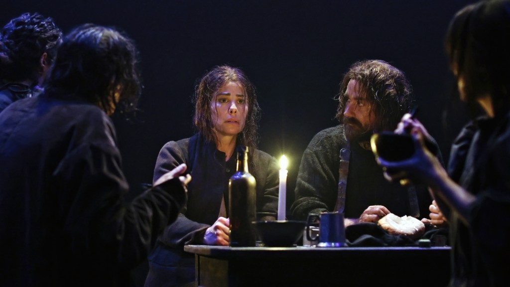 One intriguing aspect of Emma White’s set design is that the performance space was raised via the medium of some very black sand. It meant that every character in the show literally left their carbon-looking footprint on the stage.