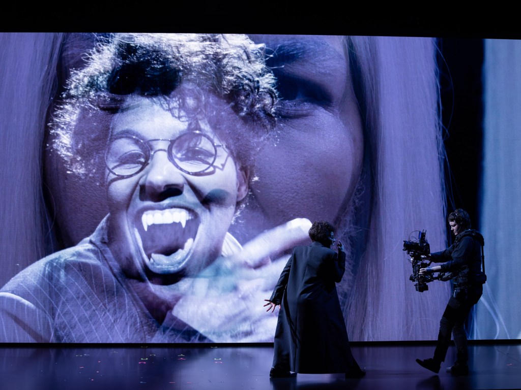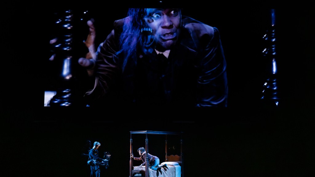 Harker turns to the camera-operator next to him and explains to the audience that he thought he was alone because the reflection in his mirror informed him that there was nobody else in the room. As Harker speaks, our eyes are drawn to the large LCD screen hovering above the stage. We can see a close-up of Harker’s brightly illuminated face on the screen. And, sure enough, Dracula stands behind him with crimson hair and canine teeth which project like daggers, a look of desire in his eyes as he peers towards Harker’s exposed neck.