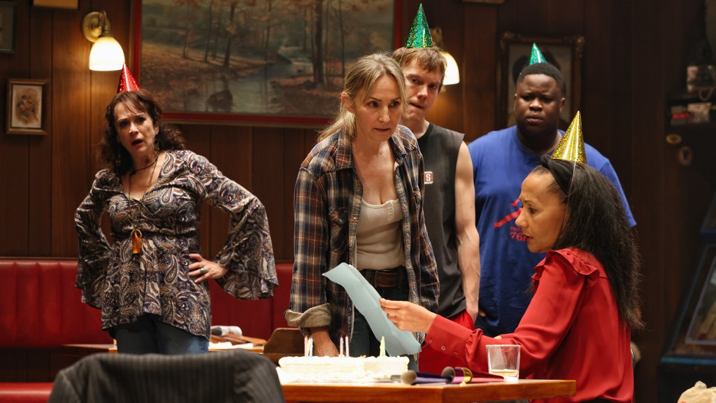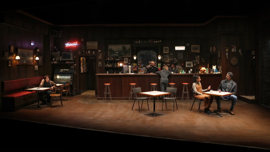 Childhood friends, Tracey (Lisa McClune), Cynthia (Paula Arundell) and Jessie (Deborah Galanos) are meeting at the local bar. There’s a jukebox in the corner and an electric Budweiser sign on the wall. Tracey and Cynthia are dancing and carousing and generally making a spectacle of themselves. Jessie is slumped over two bar stools. Stan (Yure Covich) is behind the bar, dispensing drinks and small-town wisdom.