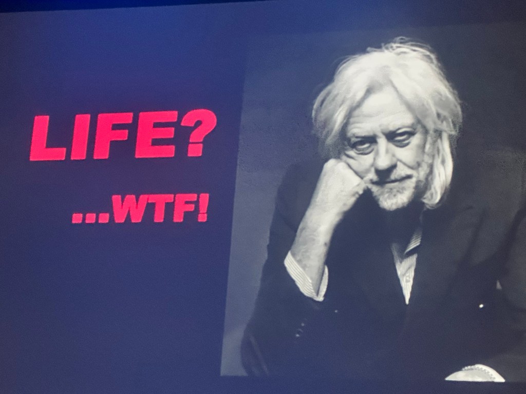 Geldof has been speaking for two hours and fifteen minutes without a break, his manic energy defying his seventy-three years. We’ve heard about his upbringing in Dublin, we’ve heard about how his father wooed his mother by challenging his mother’s fiancé to a boxing match (and won), we’ve heard about this aimless youth and how he stumbled into being a pop star, we’ve heard about how he wrote I Don’t Like Mondays following a school shooting in San Diego. And we’ve heard plenty of expletives.